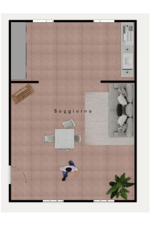 L'ingresso sfocia nella zona giorno composta dal soggiorno con camino e dalla cucina semi-abitabile .